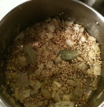 In a large stockpot, heat 2 tablespoons oil over medium heat. Add the onion, thyme, and bay leaves, and cook about 2 minutes, stirring frequently. Add garlic and barley, and cook for another two minutes, stirring continuously. You want to toast the barley a bit before it cooks- this step smells wonnnnderful.